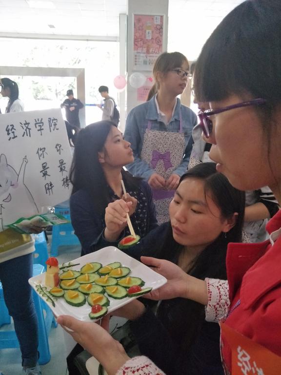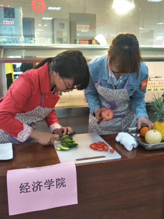 比赛内容分为两项:“对水果说爱你”、“当味蕾碰上美味”。每个参赛队伍人数为4人,2人负责水果拼盘,2人负责菜品烹饪,水果在规定的五种水果内自行选择,烹饪菜品必须为鱼香肉丝、回锅肉、麻婆豆腐三种之一,最后由评委老师品尝后现场打分产生比赛最后结果。两项比赛内容同时进行,同时现场还设置了趣味十足的游戏环节,现场气氛活跃,笑声不断。永利官网代表队的水果拼盘用黄瓜摆出绿孔雀的造型,赢得评委老师的一致好评,烹饪的麻婆豆腐也得到了评委的高度赞扬。最后,77779193永利官网代表队在18支队伍中脱颖而出,赢得了“银厨”奖。