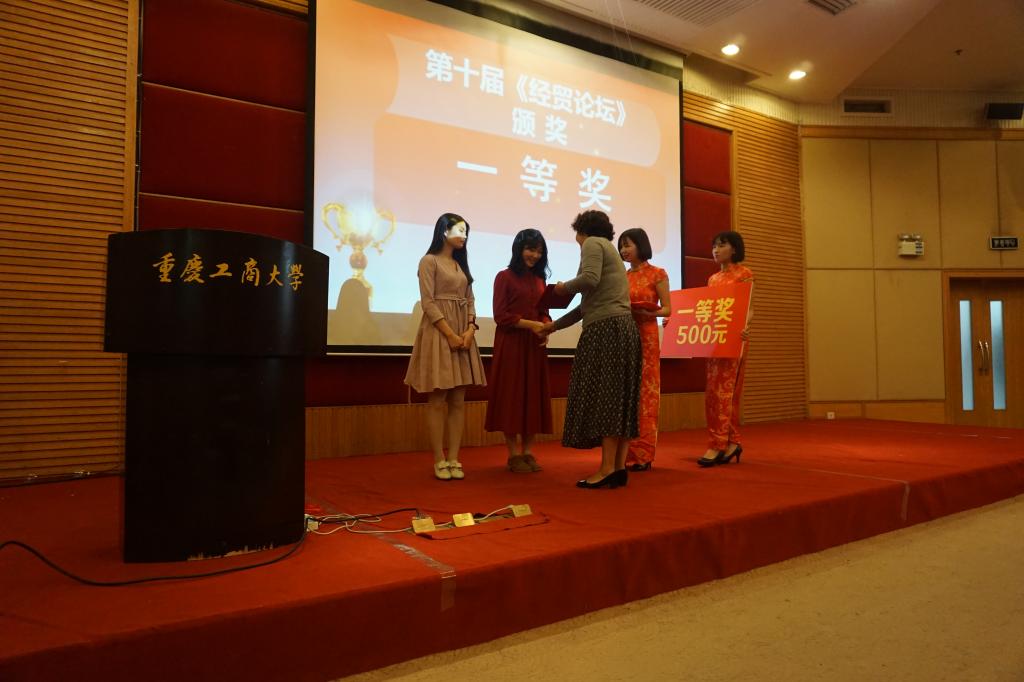 活动伊始,分党委王小玲书记介绍了“经贸论坛”活动的概况:在优秀校友赞助支持下发起,至今已经顺利开展十届,是永利官网具有专业特色的学生活动平台,本届“经贸论坛”受到广大师生积极投稿支持,经过层层评审筛选最终收录20篇优秀论文。分党委于频副书记上台公布获奖名单,由学院领导为获奖同学颁奖,优秀的获奖同学赢得在场观众的阵阵掌声。14级经济一黎润娟作为获奖同学代表发言,黎润娟与同学们分享了自己参加《经贸论坛》的收获。