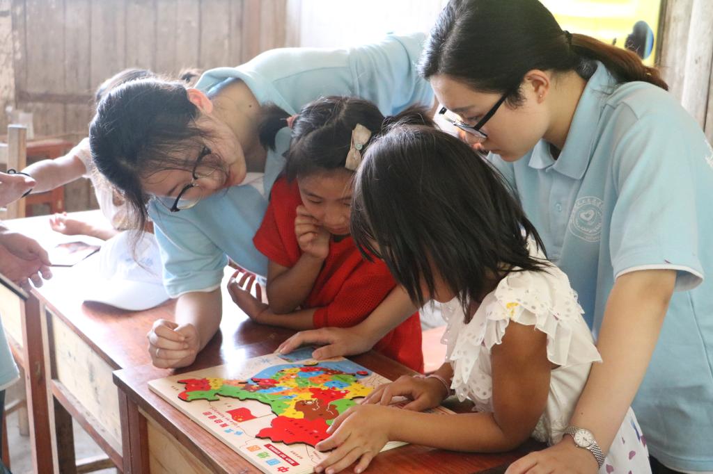 “外面的世界”:这是志愿者们为孩子们量身定做的地理课,希望他们了解大山以外的世界。志愿者讲解简单的地理知识后,将孩子们分为两组来进行拼中国地图的比赛。孩子们听得认真,赛得带劲儿,很快就掌握了志愿者教给他们的知识。