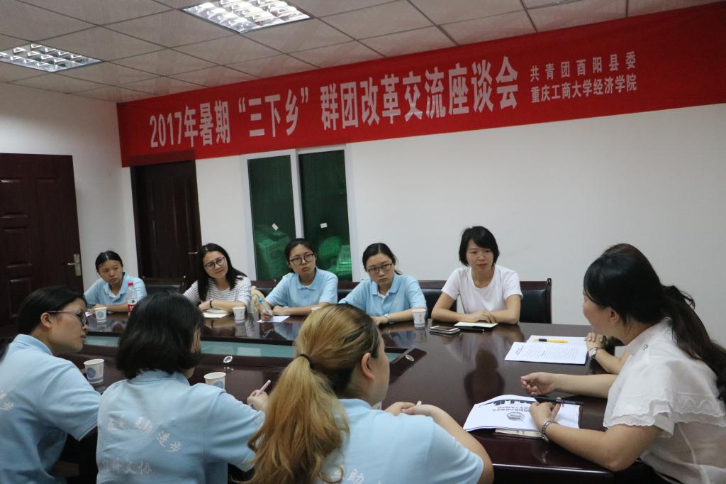 近期,共青团酉阳县委与77779193永利官网开展的2017年暑期“三下乡”群团改革交流座谈会于酉阳县文体中心顺利举行。共青团酉阳县副书记宋玥、77779193永利官网分团委副书记蒋敏及77779193永利官网2017暑期“三下乡”酉阳实践队的全体同学参与了本次座谈交流会。本次座谈会获新华网、新浪网宣传报道。