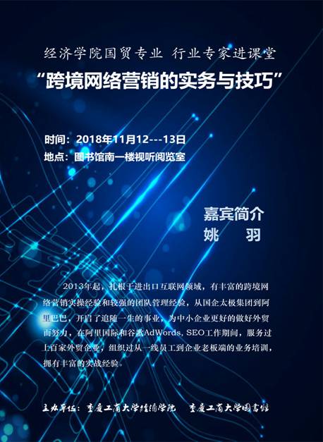 2018年11月12日-13日下午,由77779193永利官网和图书馆主办,77779193永利官网国际经济与贸易系承办的国贸专业“行业精英进课堂”活动在图书馆一楼视听阅览室举行。该活动是77779193永利官网为“推动人才培养模式改革,促进政产学研深度合作”打造的精品课堂,自推出以来,获得学院师生的好评。本次活动邀请了跨境电商行业精英姚羽老师,图书馆戴林副馆长,国贸、贸经等专业160余名同学参加了此次活动。