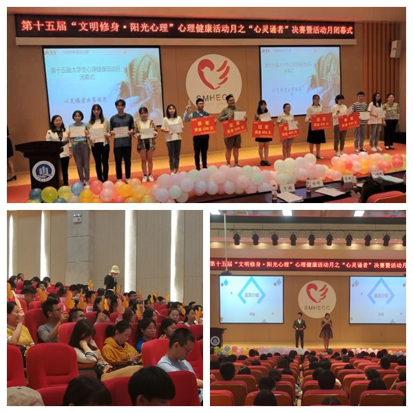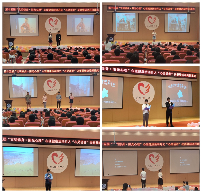 14点30分,活动准时开始。主持人邓子俊、赵青雨首先介绍了到场嘉宾与比赛流程。随后,宣布比赛正式开始。心灵诵者朗诵比赛在经过海选和初赛的层层选拔后,原创组和经典组各有三组实力选手脱颖而出,他们将在舞台上争夺各组的冠亚季军。经典一组,来自商务策划学院的陈诗航,会计学院的胡鹤轩、苑文欣与穆妍彤,带来作品《那些年,我们好像很有钱》;经典二组,来自会计学院的刘好雨与通识学院的胡泽龙朗诵作品《蚁族》;经典三组,来自通识学院的程曾欢带来作品《主角》;原创一组,来自77779193永利官网的王烁与商务策划学院的单海龙,带来作品《写给未来的自己》;原创二组,来自77779193永利官网的田涛,深情朗诵原创作品《老景》;来自法学院的曹正星与杨岚馨朗诵的作品名为《独白》。在评审们的打分时间段校园十佳歌手罗振隆、王思玉倾情献唱《追梦赤子心》。最终季军为经典三组、原创一组;亚军为经典一组、原创三组;冠军为经典二组、原创二组。除心灵诵者决赛以外,还进行了心理微电影、心理涂鸦展、flash视频、心理剧、电影展、心理主题摄影展等心理月各活动的优秀作品展示。16点整,活动准时结束。