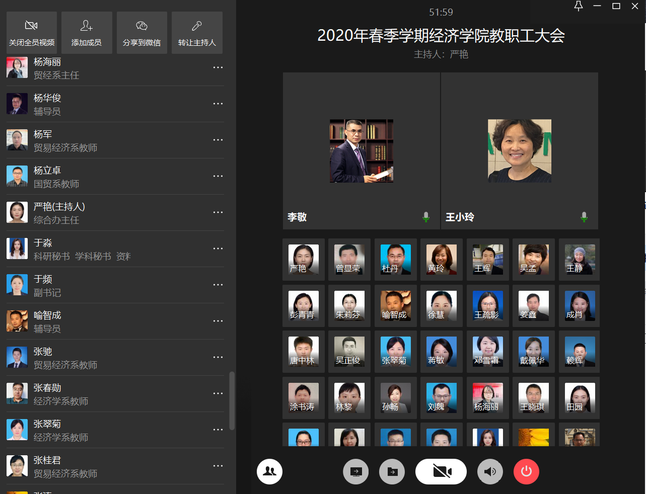 最后李敬院长做大会总结,他强调,当前正是疫情防控工作最关键、最吃紧的时期,全体教职工应高度重视,强调政治站位,强化责任担当,鼓励广大教师从专业角度出发,多学习、多研究,不信谣、不传谣,为疫情防控做出应有贡献。