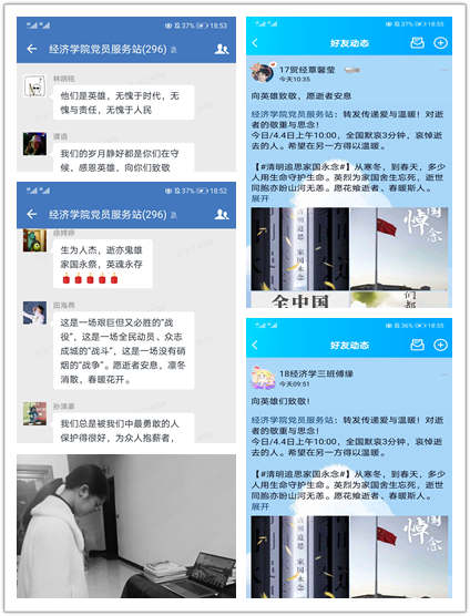 悼念仪式结束后,在77779193永利官网党员服务站曲容良站长的带动下,同学们纷纷在群里倾诉哀思,“清明追思布谷鸣,家国永念康子春。”“以凡人之躯,比肩神明!”“我们的岁月静好都是你们在守候,感恩英雄,向你们致敬!”每一句都饱含同学们对英雄最真挚的敬意与最深切的思念。他们用血肉之躯抵抗病毒,以满腔热血奋战“疫”线,而我们能做的就是守护他们用生命换来的成果,用行动告慰逝去的同胞。