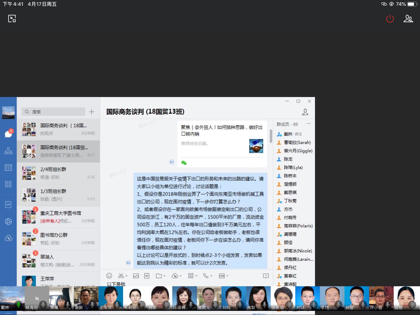 会议的第二阶段是探讨如何学院线上线下混合金课的培育。首先明确了学院拟前期探索与培育的9门混合金课,分别是“微观经济学”、 “政治经济学”、 “世界贸易组织”、 “贸易经济学”、“零售学”、 “商品学”、 “国际贸易实务”、 “国际商务谈判” 、“会展概论”。对于线上线下混合“金课”如何建设的问题,学院教指委副主任委员、“世界贸易组织”课程组长谢新教授认为打造“金课”很重要,在线教学的全面开展是大家集中智慧的体现,特别强调要充分利用线上的资源,对课程内容继续深化与完善,把更多更好的工具引入到教学中。校督导、“会展概论”课程组长杨军副教授提出了“双线结合”和“四位一体”,“双线结合”即线上线下结合,“四位一体”是指线下课堂面授、加强实践认知、丰富在线资源及充分利用直播。经济系副主任、“微观经济学”课程组长刘斌副教授就微观经济学混合金课建设提出了线上线下学时划分、试点先行还是全面推进的思考。国贸系主任、“国际贸易实务”课程组长蒋兴红副教授则认为对在线教学的教学设计、考勤方式、预习方式、作业布置要进行全面规范与改革。贸经系主任、“商品学”课程组长杨海丽副教授提出以线下为主、线上为辅的形式开展,加强课程难度,打造出有高度、有深度、趣味性强的混合金课。“国际商务谈判”课程组长戴林副教授分享了在线教学课程设计中增加场景式问题、实施开放式讨论、提高年轻人的接受程度方面的实践经验。