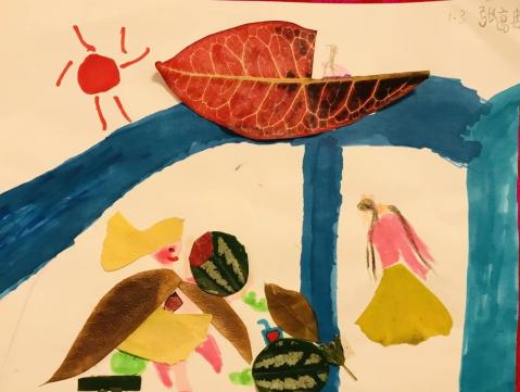 花叶冷水花的叶片形态独特,因酷似西瓜纹路,成为小朋友制作叶子画的优质素材。曾有一年级小朋友以校园南区操场旁樟树下的花叶冷水花叶片为原料,创作了西瓜地、吃西瓜的小姑娘等生动有趣的叶子画作品,让平凡的植物成为童年创意的载体。