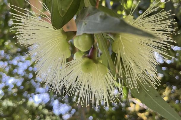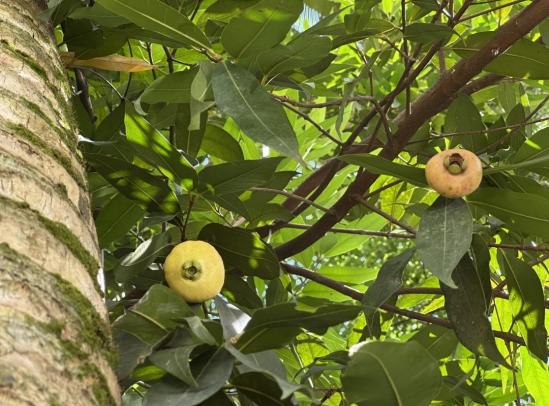 蒲桃在校园中扎根于翠湖周边,翠湖风雨长廊下生长着几棵枝繁叶茂的成年蒲桃树,往翠湖下游走去,还能见到两棵尚未长大的蒲桃幼树。平日里的蒲桃树看似平凡,四月会悄然绽放茸茸白花,淡绿花心藏于绿叶间,花序娇贵别致;历经三个多月的生长,枝头便结出串串果实。