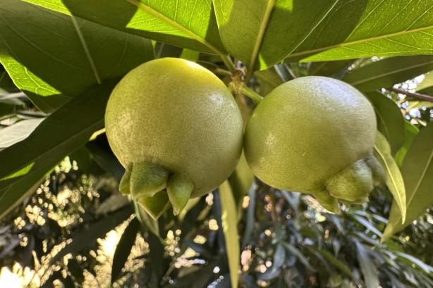 蒲桃为桃金娘科常绿乔木,主干短且分枝繁多,性喜光、喜高温,叶片呈革质状。植株开伞状花序,花色素洁淡雅并泛着淡绿,花期绵长;果实为球形,成熟时呈黄色,自带玫瑰香气,种子与果肉相剥离,轻摇果实便能摇出声响。蒲桃与莲雾同科,其果实可食用,但口感不及莲雾,直接食用有可能致敏或引发肠胃不适。