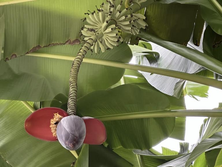 芭蕉为芭蕉科芭蕉属多年生草本植物,植株可长至2.5-4米,株型粗壮挺拔,辨识度极高。叶片呈长圆形,长2-3米、宽25-30厘米,叶面鲜绿光亮,舒展大气;花序顶生且自然下垂,苞片呈红褐色或紫色,雄花生于花序上部,雌花在每一苞片内成列生长,每列约10-16朵。